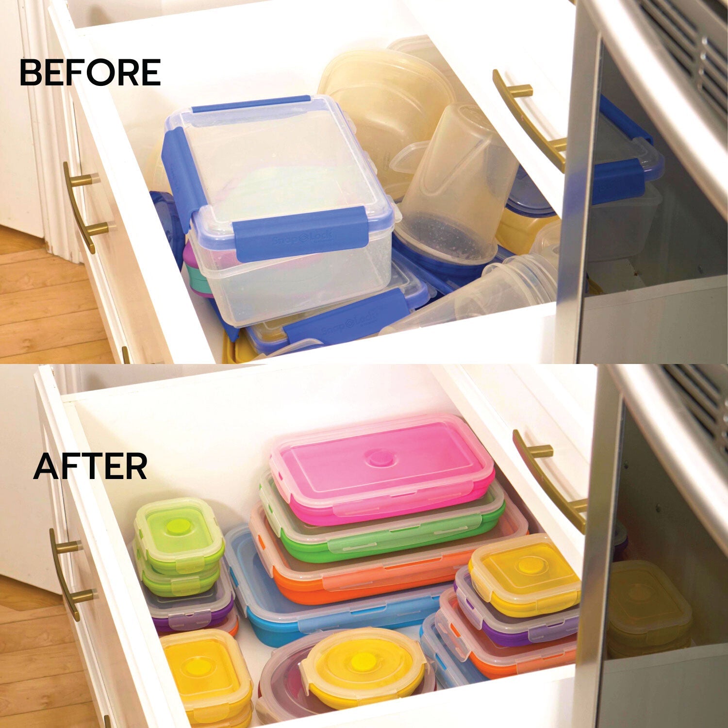 Flat Stacks collapse down while not in use to save up to 60% of space and help keep you organized. Flat Stacks also have matching colour-coded lids that can stay attached while stored. This will save you time searching for matching lids and containers.