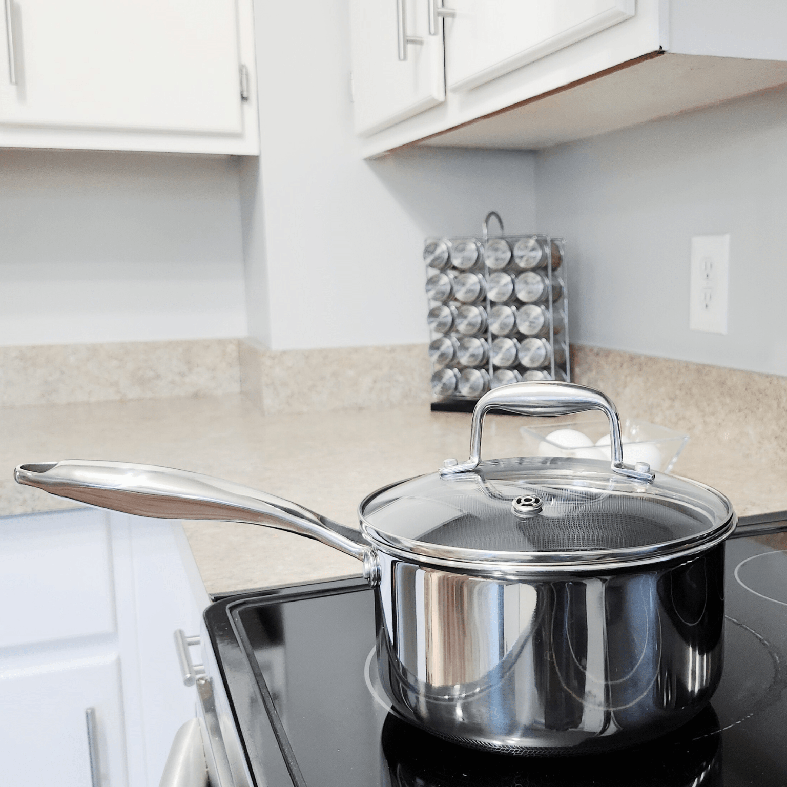 Using our unique laser etching process, the saucepan is uniquely crafted with a distinctive pattern. Not only does this pattern provide unparalleled heat distribution of peaks and valleys for even cooking, but it also protects the pan against peeling and flaking, ensuring that your cookware stays looking brand new for years to come.